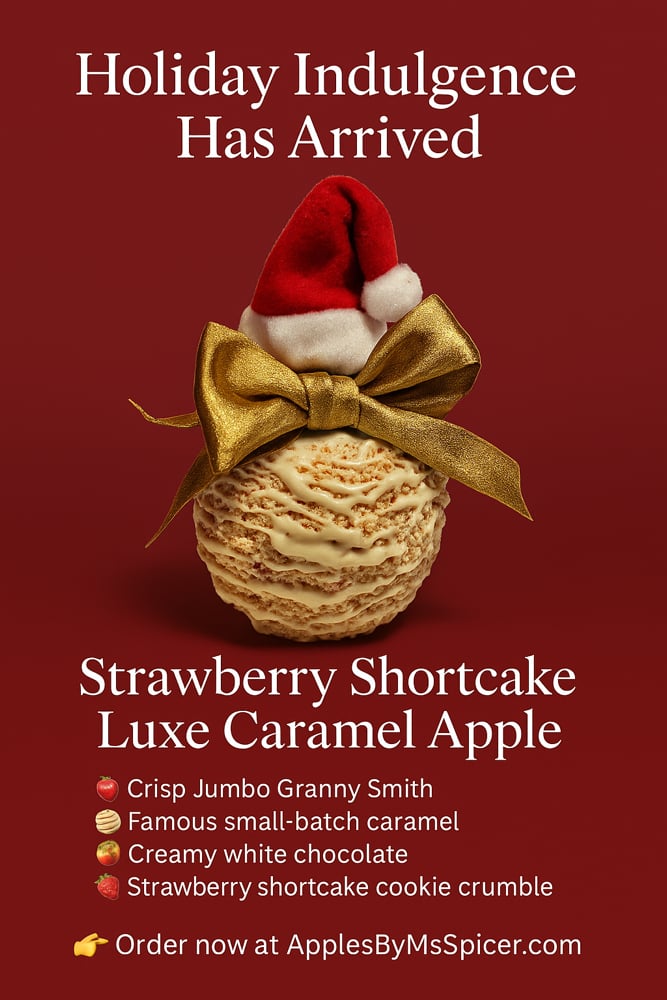 Handcrafted in small batches, each apple begins with a crisp Jumbo Granny Smith, plunged into our famous slow-cooked caramel, then generously coated in silky white chocolate. It’s rolled in our signature strawberry shortcake cookie crumble, drizzled with elegant ribbons of white chocolate, and finished with festive holiday charm.